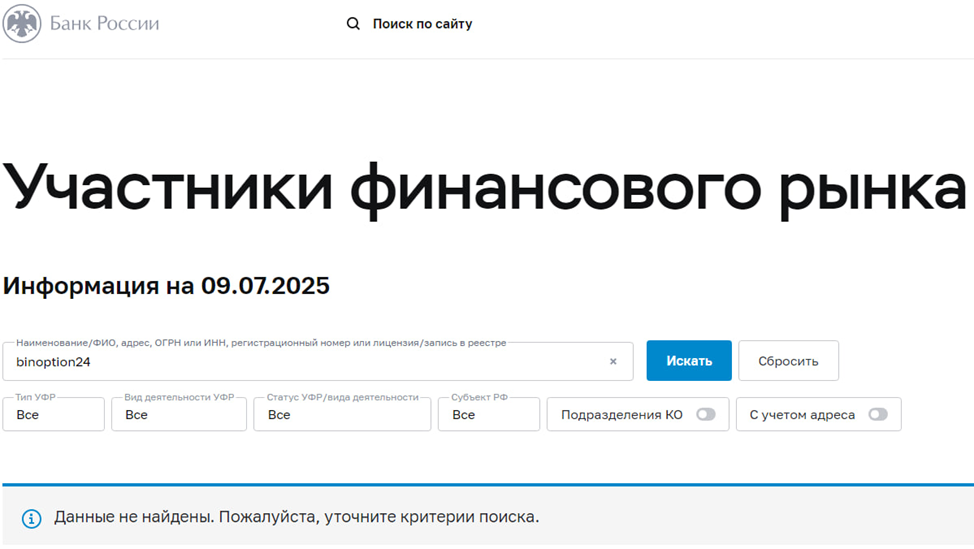 Проверка на наличие лицензии от Центрального Банка РФ показала, что ее нет. Брокер Binoption24 Com подвергал россиян опасности. В случае возникновения проблем или утечки конфиденциальной информации, им не к кому было обратиться за помощью.