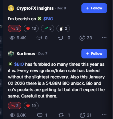 Многие пользователи называют BIO Protocol скамом, это неудивительно, ведь если посмотреть, что происходит криптовалютой BIO, прогнозы на 2025г, то можно увидеть, что многие инвесторы могли потерять средства с ней. Сразу после листинга монеты, ее стоимость обрушилась. Хотя некоторые аналитики говорили о том, что такое положение дел нормально, что курс вырастет, в реальности это не случилось. Рост был весьма незначительным, а 11 октября 2025 года токен установил новый антирекорд, когда торговался по цене 3,7 цента за монету. После ATL монета за 2 месяца прибавила в цене лишь 12%. При этом на момент проведения обзора стоимость токена упала на более чем 95% от уровня ATH. При этом каких-то перспектив в обозримом будущем, которые бы говорили о том, что токен будет расти, нет.