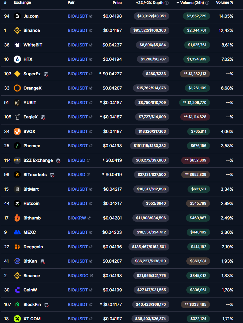 В циркулирующем обращении находится 1,89 миллиарда монет. Купить токены БИО можно на разных биржах и в разных торговых парах: