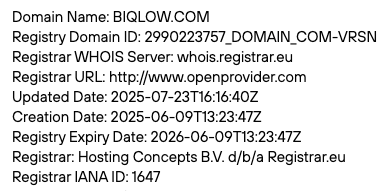 Получив из него сведения, мы узнали, что адрес biqlow com регистратор выдал только в июне 2025-го года. Каких-либо других доменов к сайту не привязано.