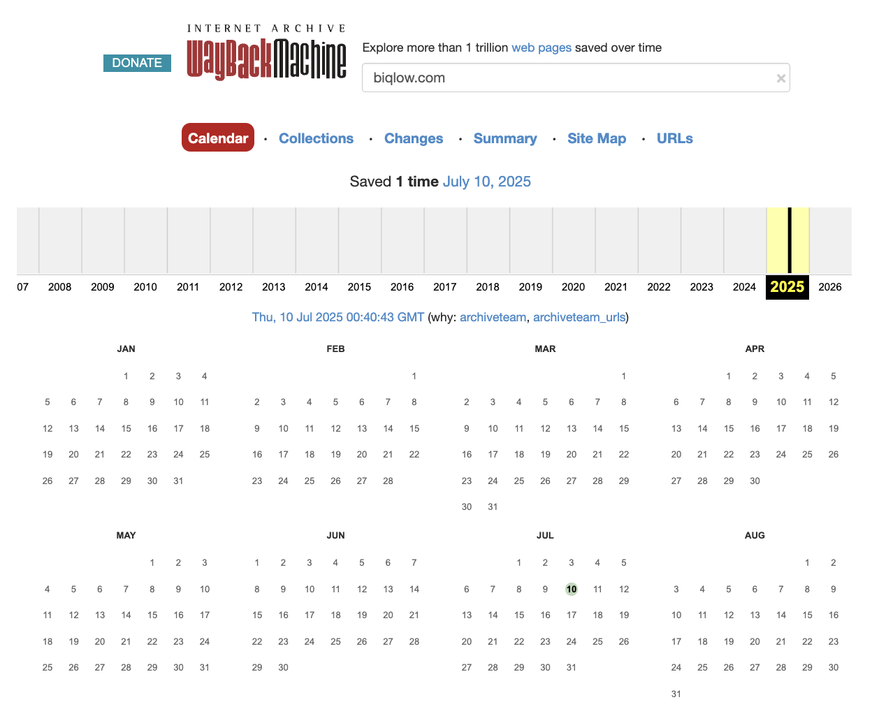 В сервисе WayBack Machine, в свою очередь, присутствует только один снимок веб-ресурса. Он сделан 19 июля 2025-го года и корректно не отображается.
