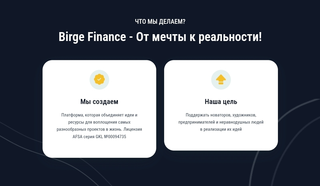 Юридически BirgeFinance якобы связана с ТОО Life Investments из Астаны, но кроме слов подтверждений нет. На странице «О нас» упомянута лицензия AFSA. Проверить подлинность этой лицензии можно через открытый реестр регулятора, однако никакой ссылки на реестровую запись платформа не предоставляет. При подлинной лицензии от серьёзного регулятора ее публикуют с прямой ссылкой — это стандарт прозрачности. Здесь же пользователю предлагается просто поверить на слово.