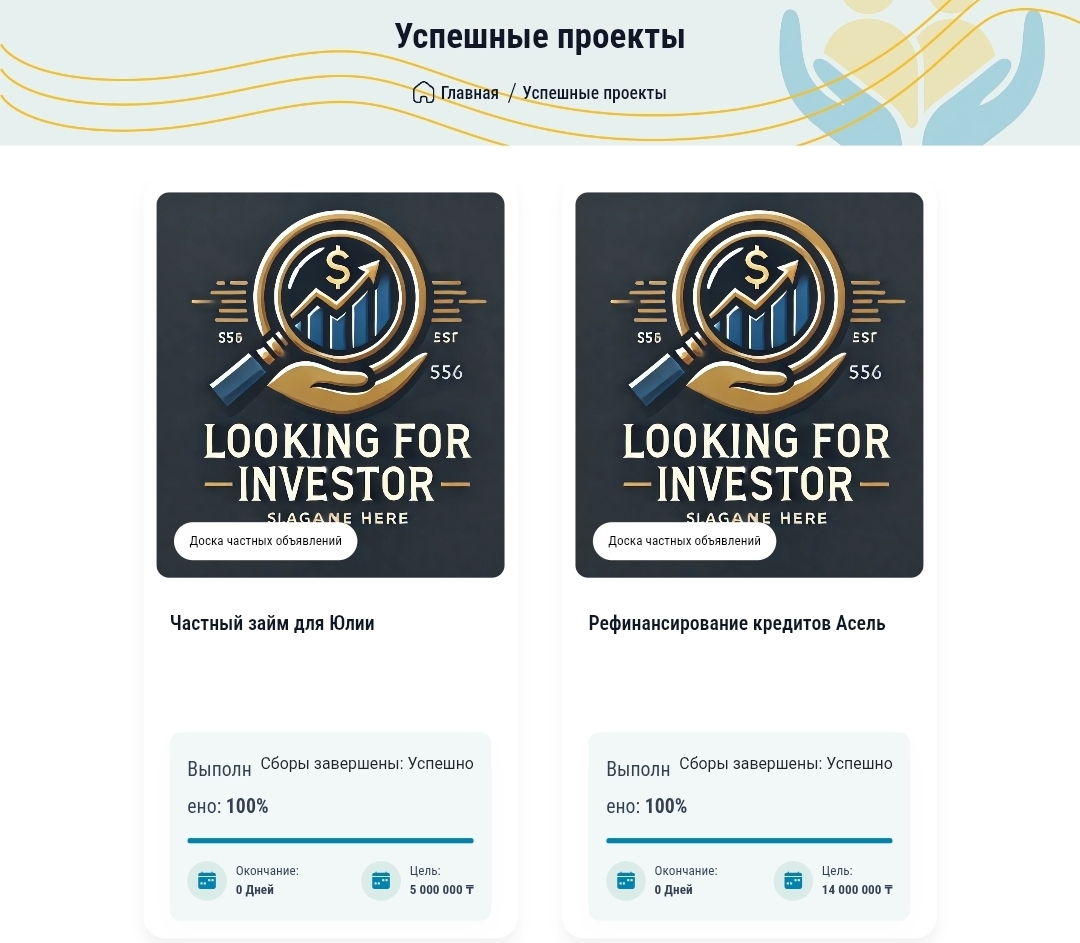 Среди размещенных проектов — ИП Тажин (переработка алюминия, запрашиваемая сумма 25 000 000 тенге, срок займа 60 месяцев, ставка 23% годовых) и ИП Asia Transfer (грузоперевозки, цель сбора 85 000 000 тенге, ставка 20-24% годовых, срок 5 лет). Оба числятся как завершенные на 100-102%. При этом изображения для части проектов в разделе «Успешные проекты» — идентичные шаблонные стоковые картинки с надписью «Looking for Investor», что говорит об откровенно формальном подходе к оформлению. Настоящие фотографии производства, офиса или команды заёмщика не представлены ни по одному из проектов.