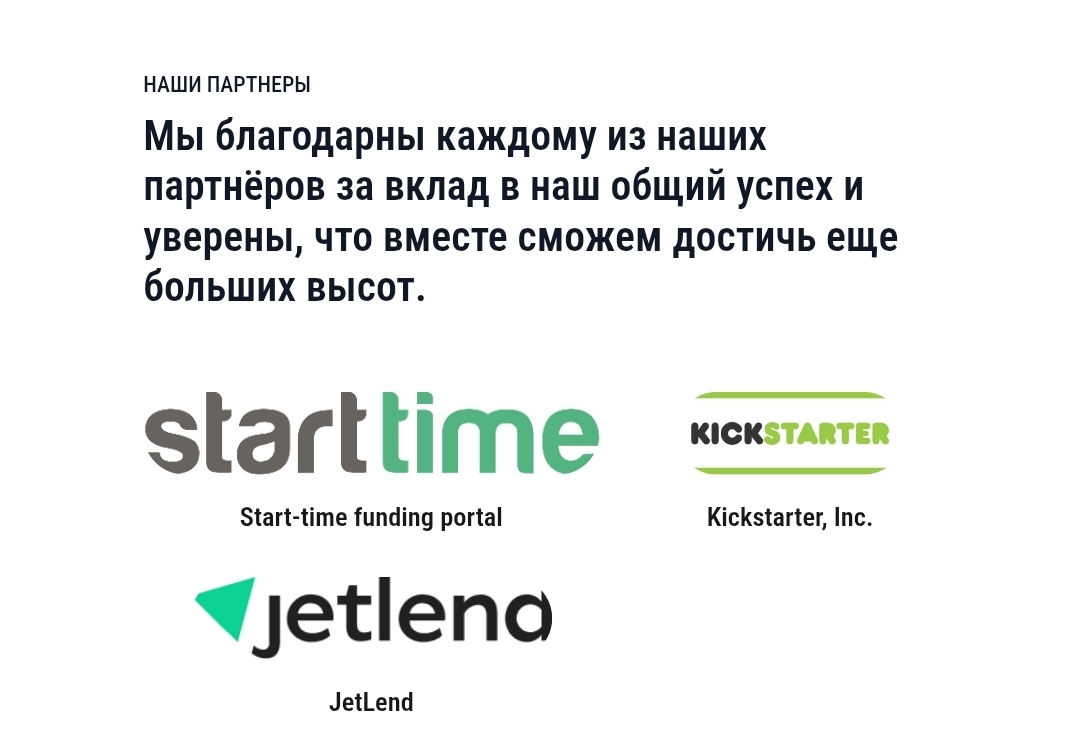 - логотипы Kickstarter и JetLend в разделе «Партнёры» не подкреплены публичными соглашениями;