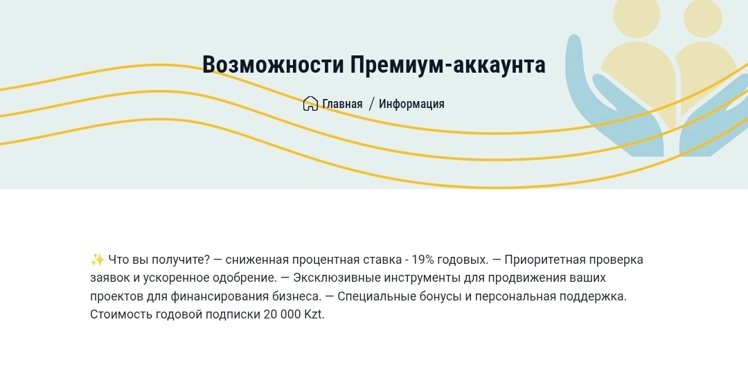 Отдельного внимания заслуживает Премиум-аккаунт за 20 000 тенге в год. По заявлению площадки, он снижает ставку по кредиту с рыночной до 19%, ускоряет рассмотрение заявки и дает персональную поддержку. Фактически платформа берет деньги с заемщика еще до того, как он получил хоть какое-то финансирование. Для сравнения: легитимные краудлендинговые площадки, как правило, монетизируются исключительно на комиссии от успешно закрытых сделок — а не через платный доступ к «ускоренному рассмотрению». Этот момент заслуживает пристального внимания.