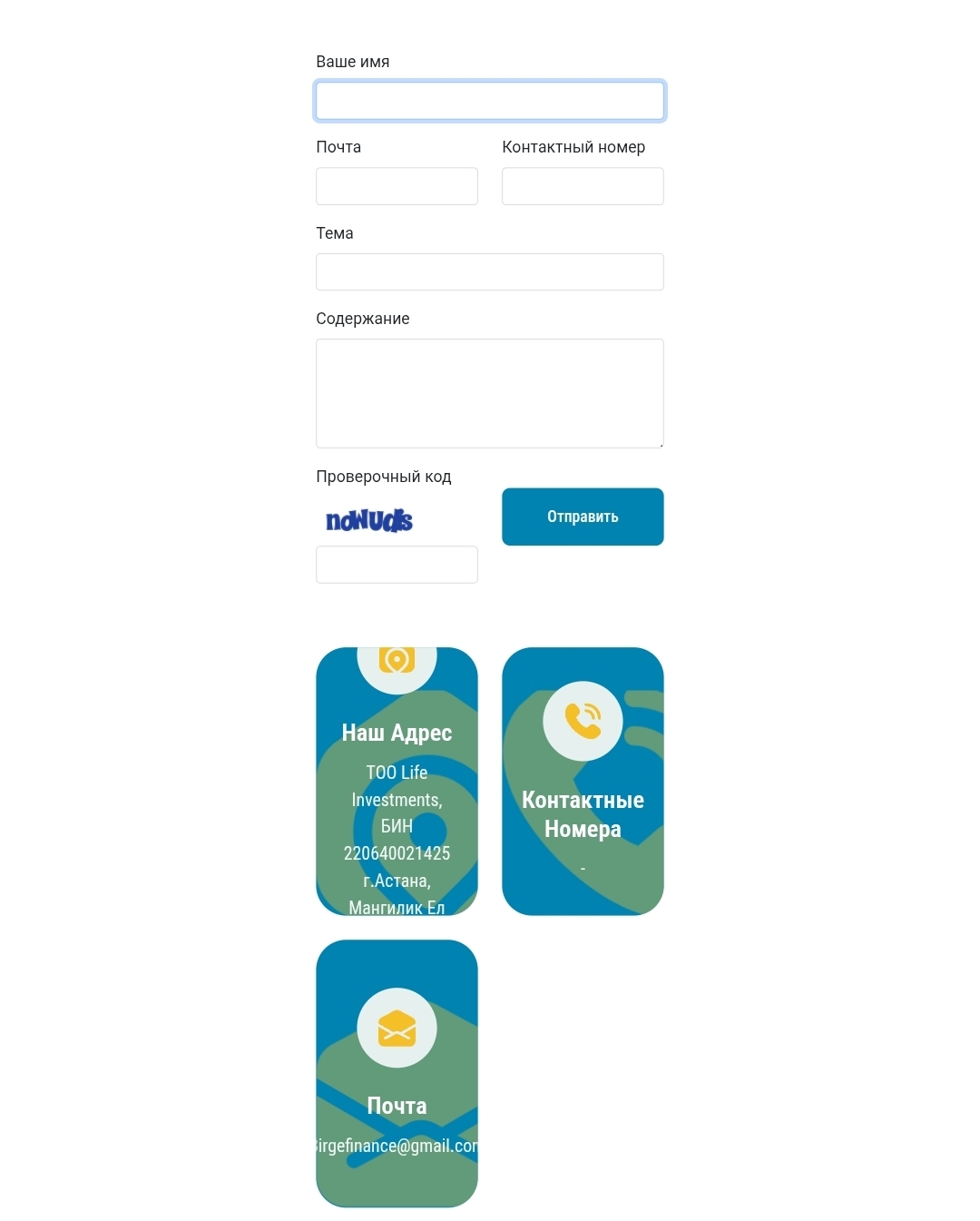 Контактных телефонов на сайте нет — в соответствующем поле стоит прочерк. Единственный способ связи — форма обратной связи и почта Birgefinance gmail com. Использование бесплатного почтового ящика Google вместо корпоративного адреса на собственном домене — сигнал, несовместимый с образом финансовой организации, управляющей десятками миллионов тенге. Это не мелочь: любая легальная финансовая платформа, тем более лицензированная, использует корпоративную почту.