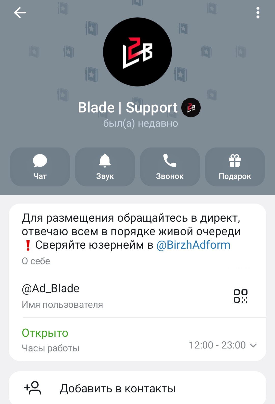 Для приобретения телеграмм-группы нужно писать на страницу Михаила (viasov tg). Для размещения объявлений о покупке предлагают обращаться к Ad BIade. Настоящие имя и фамилия специалиста не приводятся. Указано, что на связи он с 12 дня до 11 вечера. Писать он предлагает не в Телеграмм, а в Директ. Отвечает Ad BIade в порядке живой очереди.
