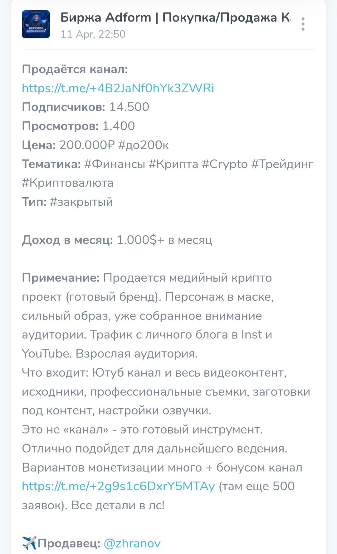 Биржа Адформ представляет собой проект, через который можно приобрести популярные каналы в Телеграмм. У нее нет официального сайта. Услуги предлагаются исключительно через мессенджер. Сообщество зарегистрировано под ником birzhadform. Ведется с 6 мая 2023 года. В нем публикуются объявления по каналам, выставленным на продажу. К каждой группе идет стандартное описание. Приводится ссылка, тематика, формат, количество подписчиков и просмотров, стоимость. Также указывается средняя доходность в месяц и текущий владелец. Иногда Михаил делает скидки на покупку некоторых сообществ. Эту информацию он выкладывает в отдельных постах.