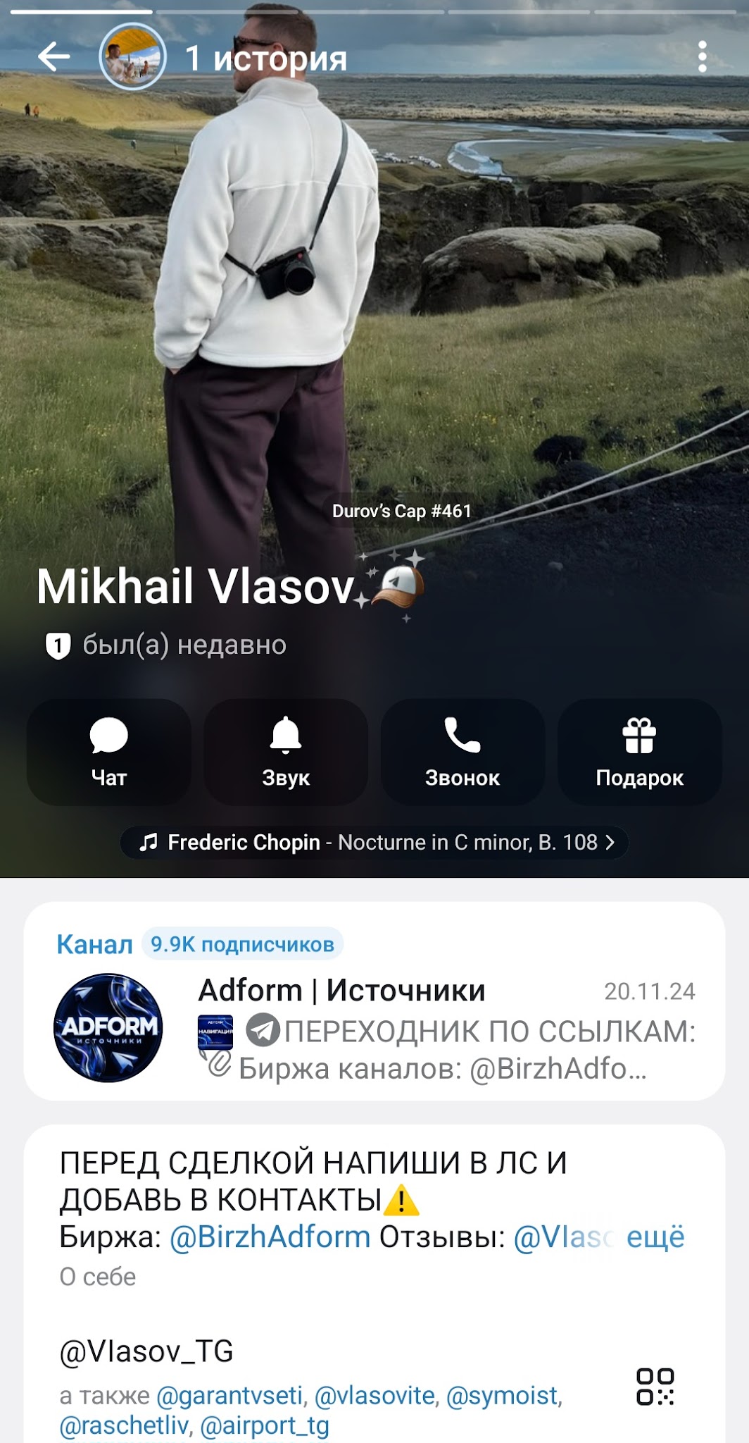 Автором канала в Телеграмм “Биржа Adform” является некий Михаил Власов. Он выступает гарантом совершения сделок. У него есть страница в мессенджере, зарегистрированная под ником viasov tg. На ней выложено его личное фото, но со спины. Поэтому понять, как выглядит Михаил, невозможно. Откуда он родом и сколько ему лет, тоже неизвестно. Номер телефона в Телеграмм скрыт. В целом Власов старается работать максимально анонимно.