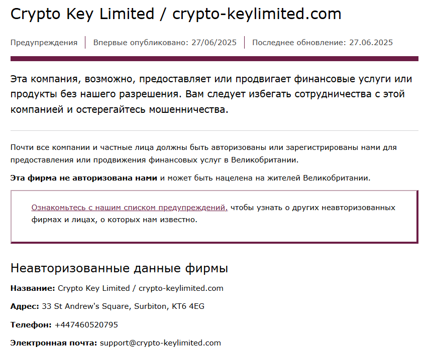 Это реальная организация, записи о которой мы нашли в реестре, так как она работает с 2018 году, но тут возникают противоречия – юридическое лицо не имеет отношения к Bit2 Cryp. Ранее этой компанией использовался сайт cryptokeyltd com, но он более недоступен, а в FCA пользователей предупреждают о мошенничестве с использованием этого названия.