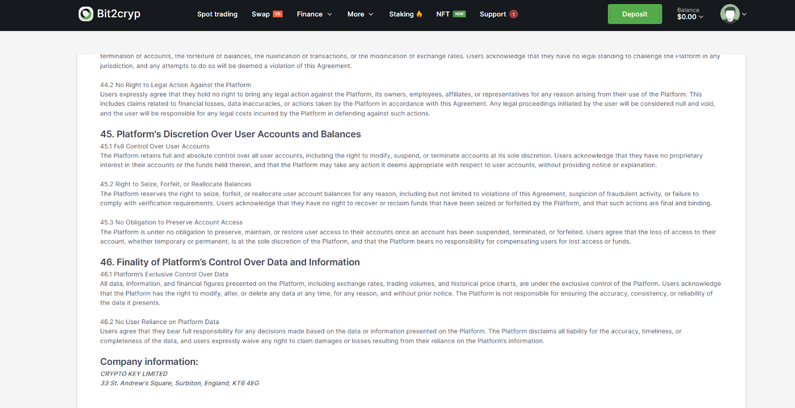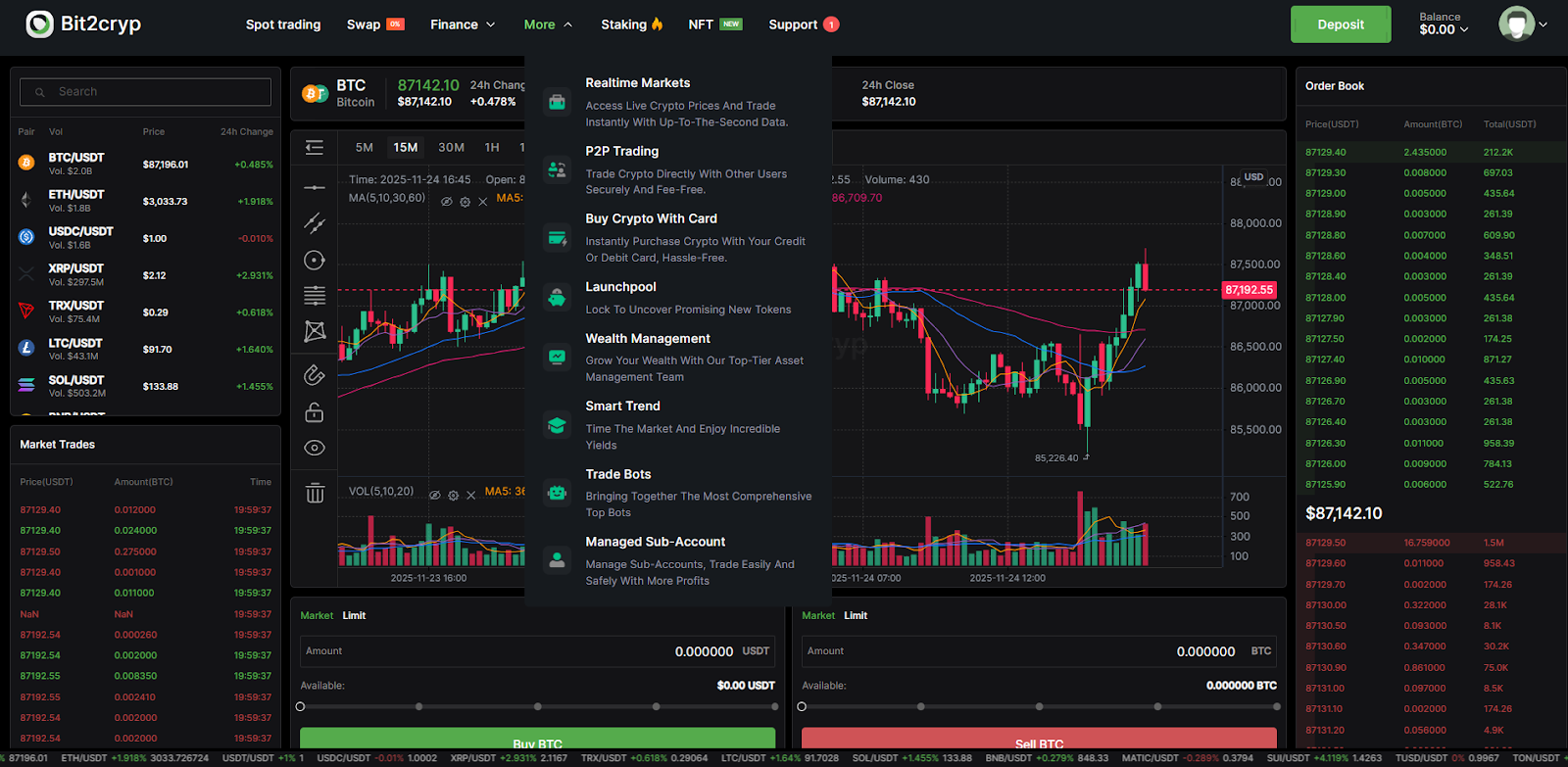 На бирже Bit2Cryp можно создавать пустые аккаунты, так как система не настроена и не проверяет данные пользователя – это говорит о плохом уровне проработки платформы. В рамках сайта можно торговать на спотовом рынке, конвертировать токены, а также размещать активы на депозит и работать с NFT.