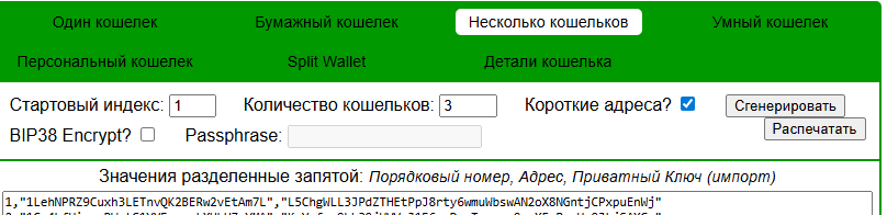Несколько кошельков – режим массовой генерации до 10 000 адресов. Подходит владельцам интернет-магазинов. Список выгружается в CSV. Приватные ключи нужно хранить отдельно от публичных адресов. Разработчики советуют делать резервные копии на разных носителях.