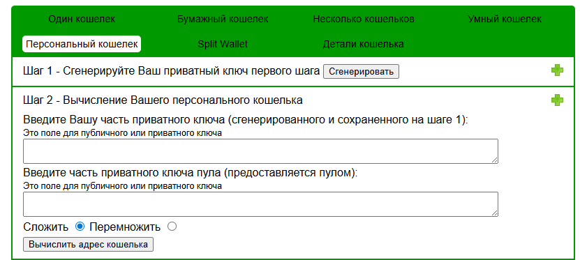 Персональный кошелек состоит из двух этапов. Сначала создается ключ первого шага. Потом добавляется часть от пула. Ключи складываются или перемножаются. Получается общий результат.