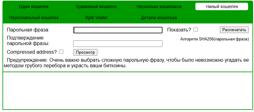 Умный кошелек работает через парольную фразу. Пользователь придумывает пароль и получает уникальный ключ. Удобно, но опасно при слабом пароле. Простую фразу взломают перебором. Нужна действительно сложная комбинация.