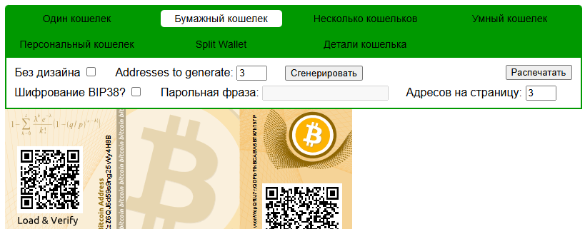Бумажный кошелек создает версию для печати. Популярный способ холодного хранения крипты. Генерируются QR-коды для сканирования. Удобно для быстрого доступа через смартфон.
