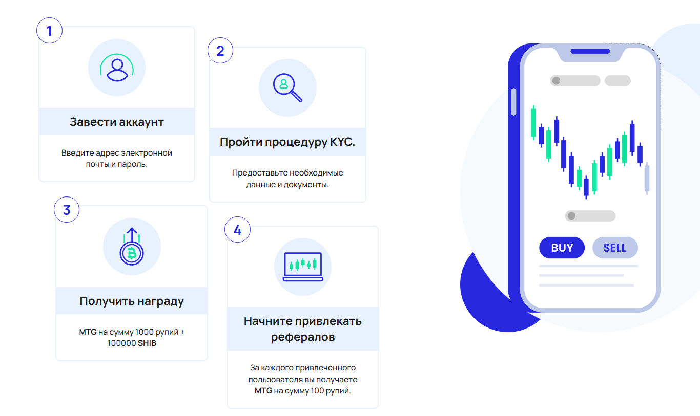Чтобы воспользоваться платформой, нужно зарегистрироваться на сайте. За регистрацию обещан бонус в токенах MTG на сумму 1 000 рупий + 10 0000 SHIB. Для дополнительного заработка можно принимать участие в реферальной программе, получая за каждого привлеченного клиента вознаграждение в монетах MTG на сумму 100 рупий.