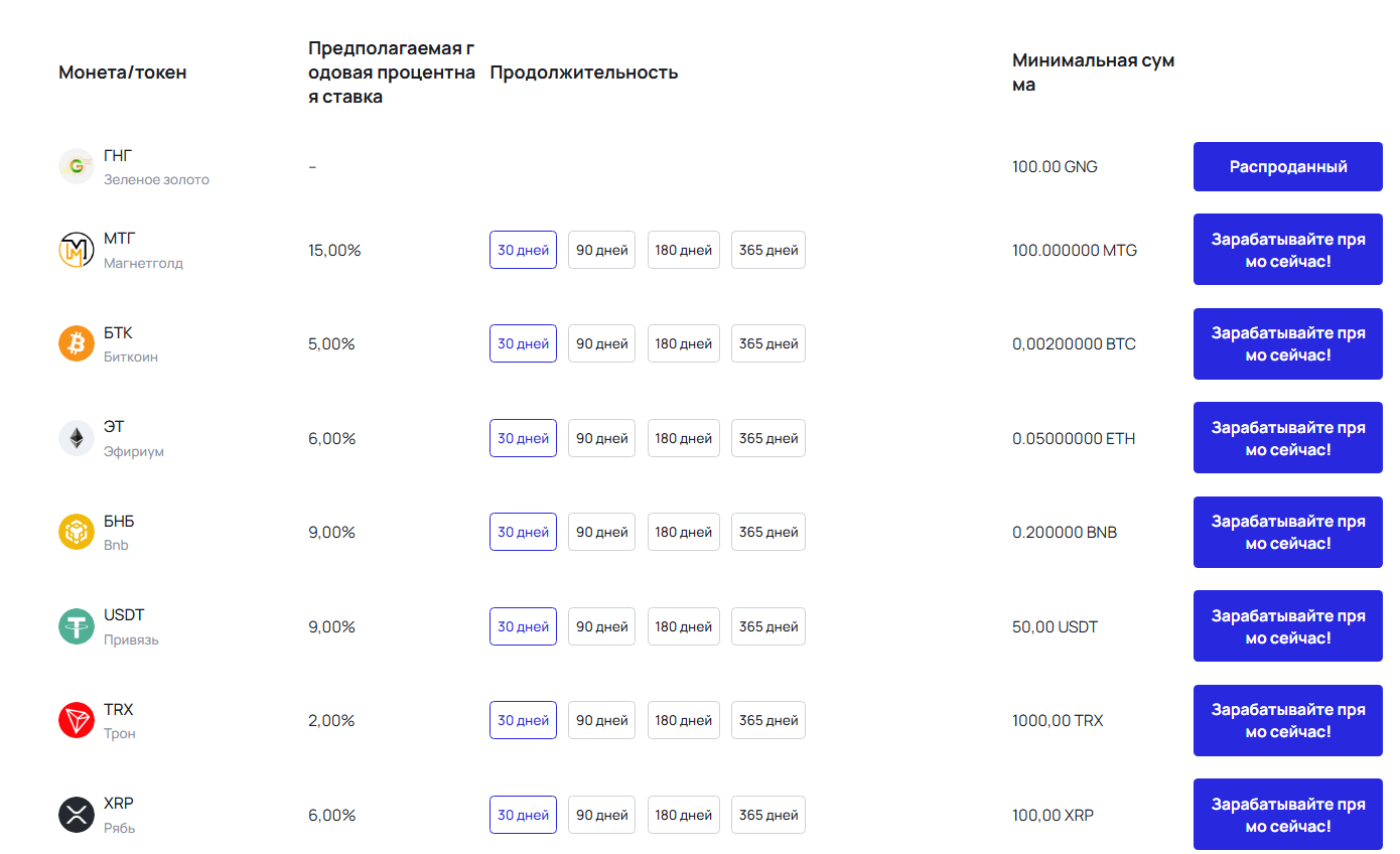 Также на площадке доступен стейкинг токенов. Есть таблица с монетами. Их можно заморозить. Условия стейкинга: срок, минимальный депозит и годовая процентная ставка доходности.