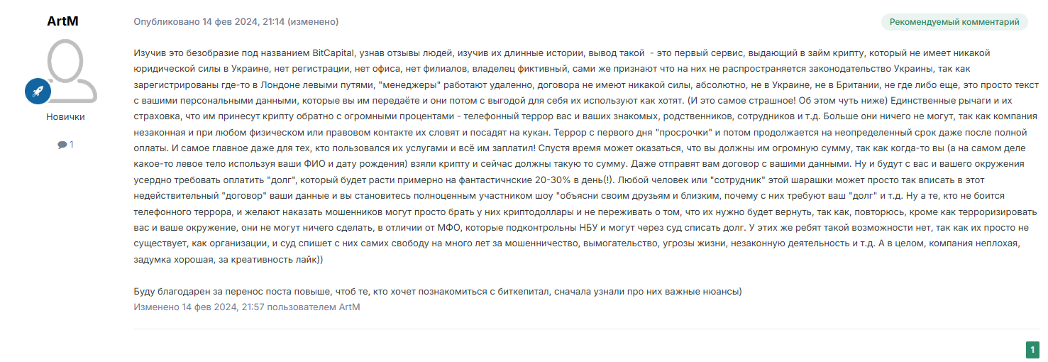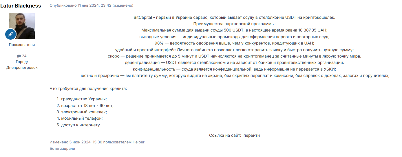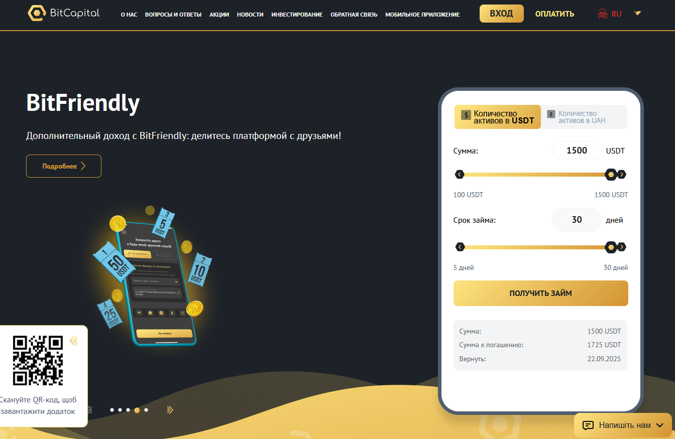 Bitcapital – инновационная платформа, на сайте которой предлагается кредитование в криптовалюте. Это украинский сервис, выдвигающий крайне невыгодные условия кредитования, которые выглядят еще более неприятно, чем у самой последней МФО. Об этом свидетельствуют, как отзывы пользователей, так и особенности продвижения платформы. В ходе обзора оценим перспективы работы с данным проектом.