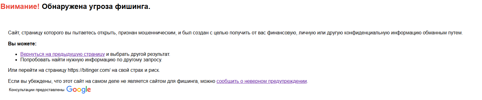 Биржа Bitinger доступна через веб версию. Но при заходе на сайт вас встречает предупреждение от браузера, что это скам сайт. Дизайн темный, на первый взгляд выглядит современно. Но это обманчивое впечатление.