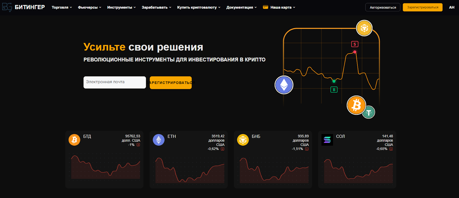 На главной странице висят котировки популярных криптовалют: BTC, ETH, BNB, SOL. Цены якобы обновляются в реальном времени. Проверить это сложно. Есть кнопка регистрации через email.