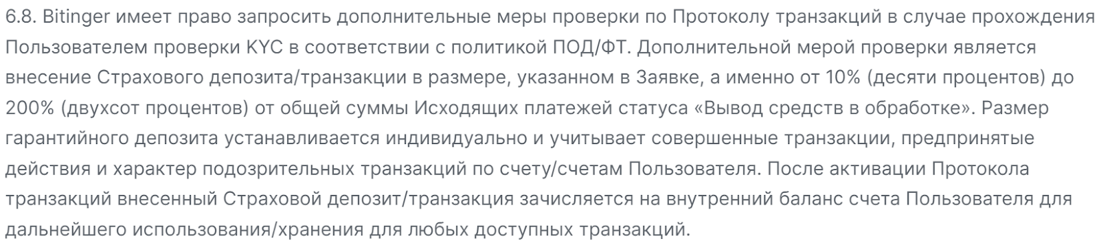 А вот дальше начинаются странности. При подозрительных транзакциях bitinger com может потребовать страховой депозит от 10 % до 200 % от суммы вывода. Называется это протоколом транзакций по политике ПОД/ФТ. Звучит как способ заблокировать ваши деньги.