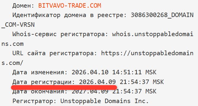 К тому же, домен Bitvavo trade com свежий – его дата регистрации 9 апреля 2026 года.