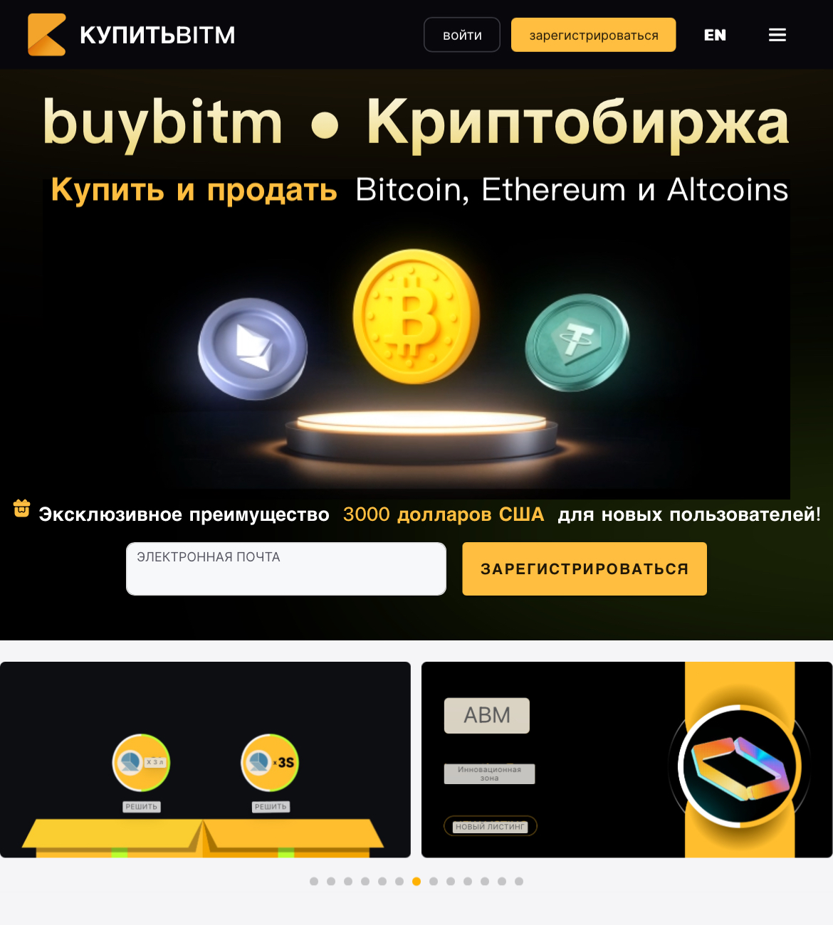 Платформа доступна на многих языках, кроме русского. На страницу невозможно зайти без VPN. Организация не нацелена на русскоязычную аудиторию. Владельцы криптобиржи предлагают зарегистрироваться на главном меню и забрать 3000 долларов для новых пользователей.