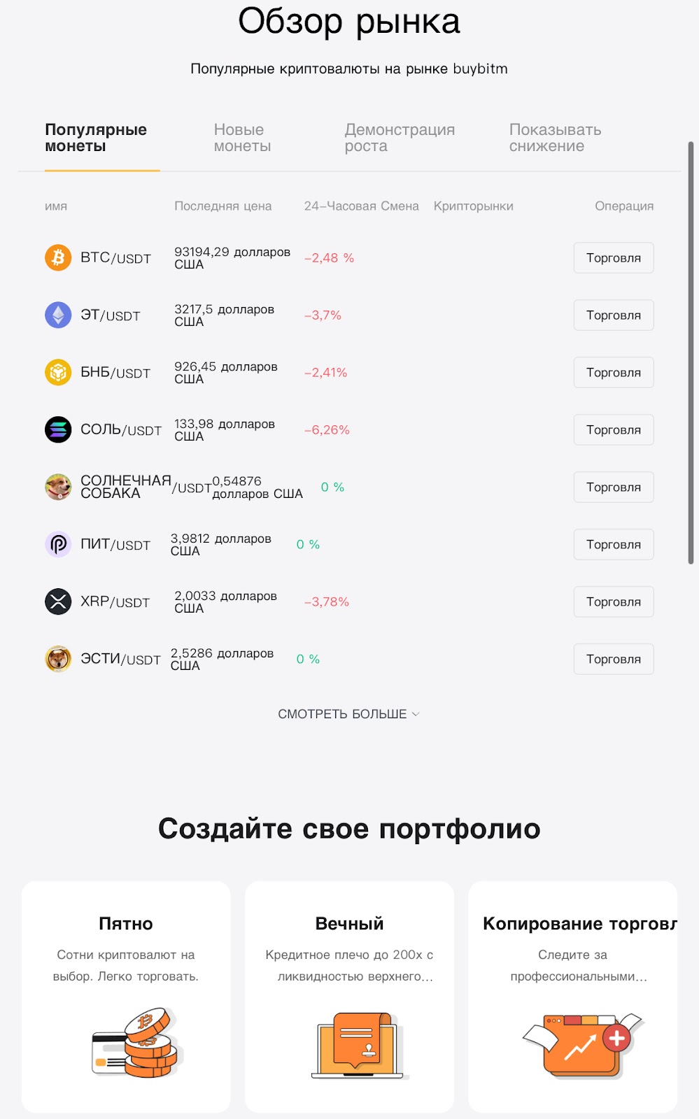 На сайте можно обозревать рынок. Доступна такая статистика как: популярные монеты, новые монеты, демонстрация роста, снижения продаж. Данные обновляются каждые 24 часа. Также Bitxc id предлагает создать на площадке свое портфолио благодаря большому выбору валют, кредитному плечу до 200х и копитрейдингу.