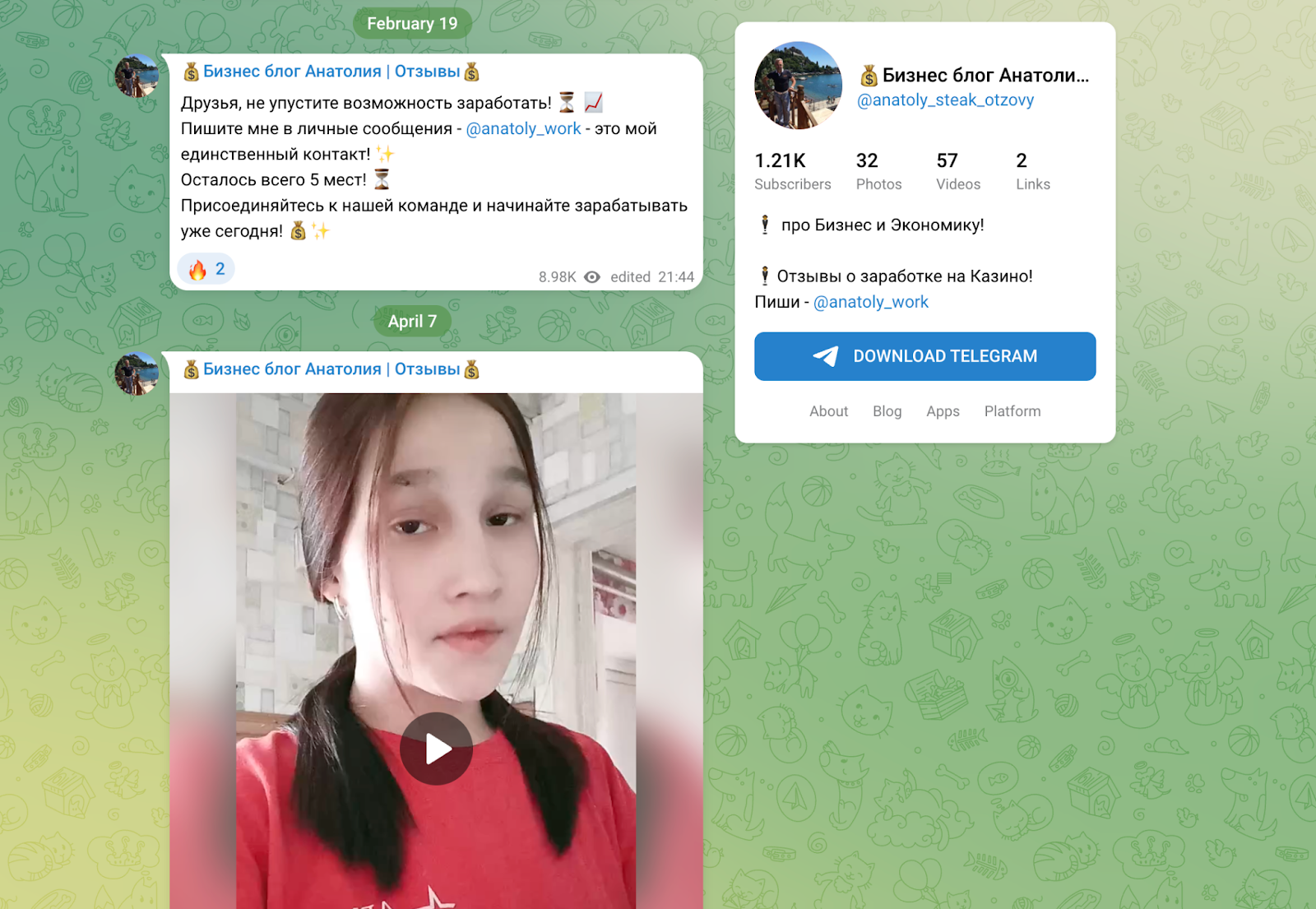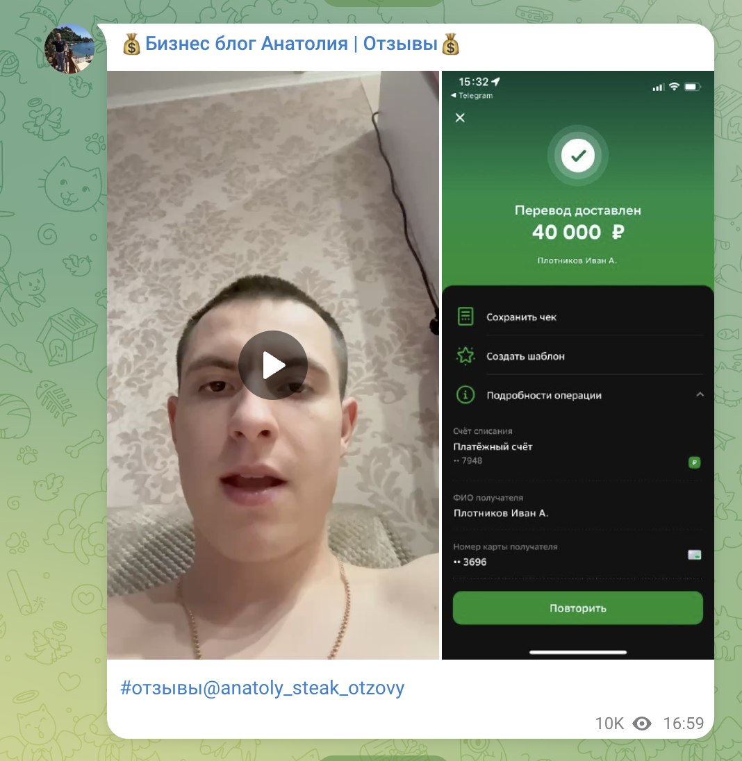 Визуально канал сделан аккуратно: скриншоты переводов, фотографии якобы довольных участников и короткие видео с рассказами о заработке. Для новичка это создает ощущение живого бизнеса.