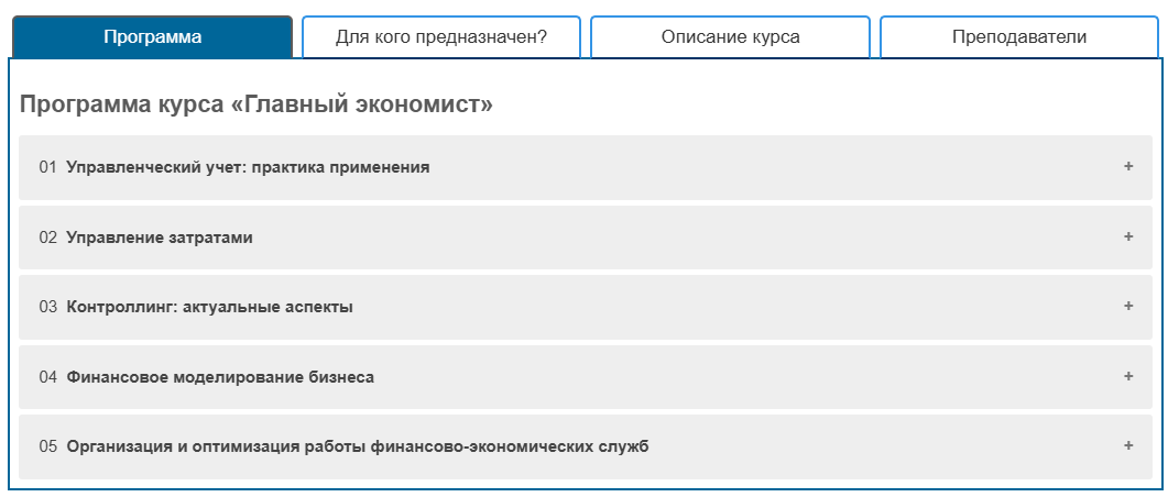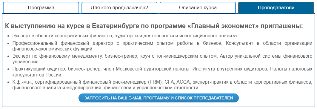 Сказать, что описание программ подробное, мы не можем, но оно все-таки есть. Представлены названия блоков и небольшой абстрактный текст. Иногда хотелось бы получить больше информации, однако здесь даже скрывают преподавательский состав. Вместо реальных имен просто перечислены должности и регалии, но почему сами наставники анонимны до покупки — непонятно.
