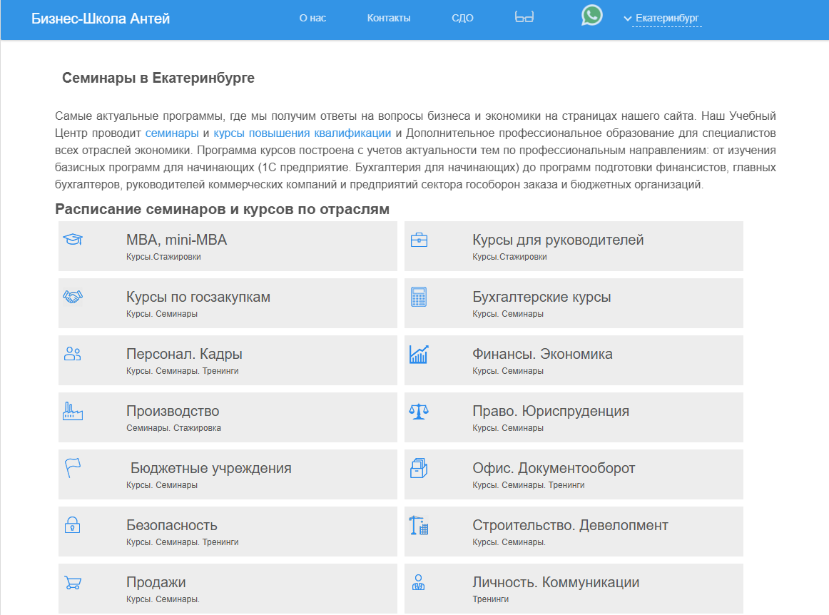 Все сведения о компании, ее продуктах и услугах есть на официальном сайте организации. Нам его интерфейс показался довольно устаревшим: похоже, его особо не обновляли с 2016 года, когда и была запущена платформа. Однако претензии есть не только к визуалу, но и содержанию. Уже на главной странице написано, что само дополнительное образование могут получить сотрудники «всех отраслей экономики». Вот только далеко не все категории тут связаны с экономикой: на изображении ниже видно: пользователям также предлагают посетить семинары по праву, производству и т.д.