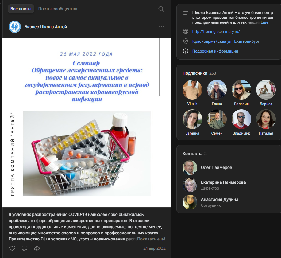 Из соцсетей «Антей» представлен только во ВКонтакте. Тут в группе всего около 260 подписчиков. Более подозрителен факт отсутствия публикаций с 2022 года и почти нулевая активность аудитории. Сейчас есть немало проектов подобного рода, которые освещают свою деятельность в интернете. На их фоне рассматриваемая бизнес-школа явно проигрывает.