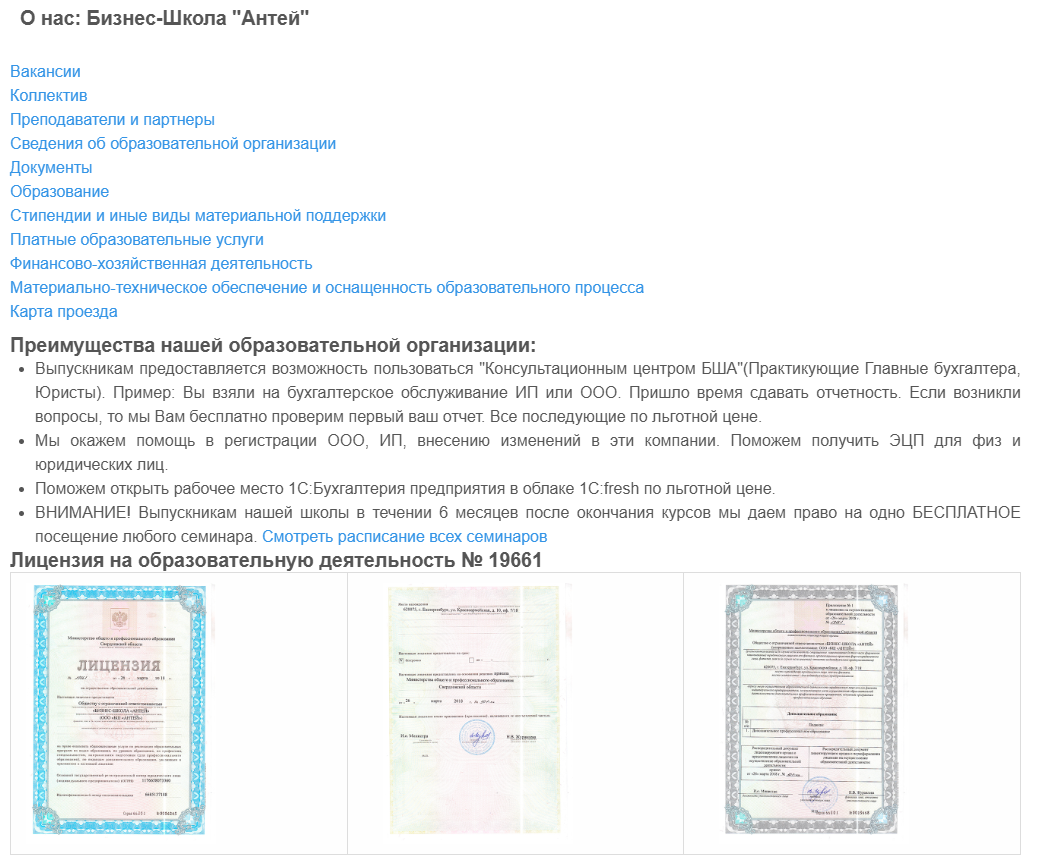 В целом насчет законности предоставления услуг к организации вряд ли могут быть претензии. В разделе «О нас» представлены реальные лицензии, которые позволяют фирме заниматься образовательной деятельности и выдавать соответствующие документы.