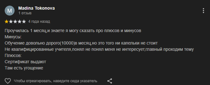 Основную часть отзывов об обучении тут оставили несколько лет назад, хотя есть и пара более свежих комментариев. В них клиенты хвалят организацию и благодарят за предоставленные знания. Мы не можем быть уверены в достоверности данных слов, тем более при исключительно положительных рецензиях общий рейтинг на сайте почему-то составляет 4,4 балла из 5.