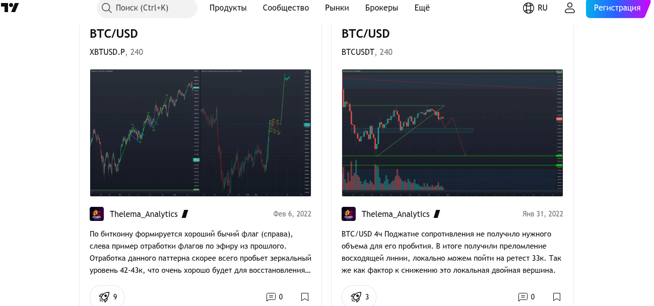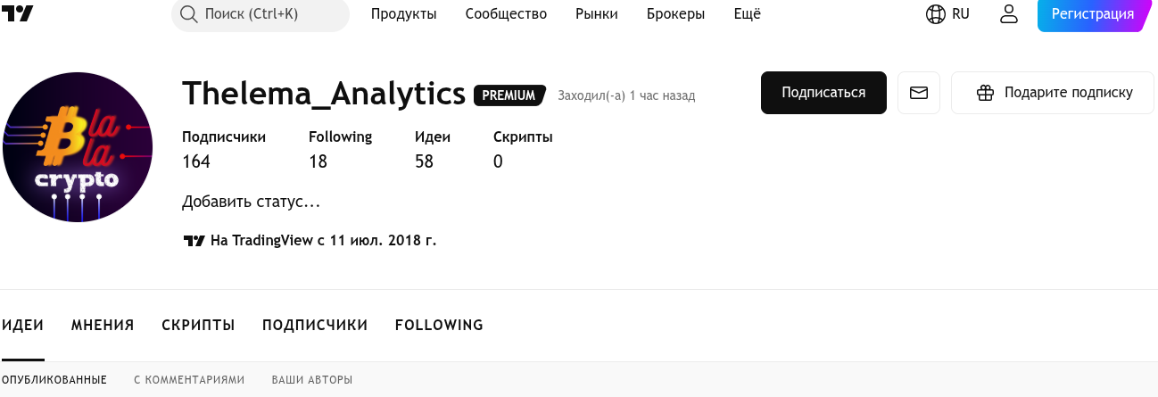 Деятельность автор сообщества ведет не только в телеграме и ютубе. У него есть ветка на релевантной площадке для трейдеров Trading View — ru tradingview.com/u/Thelema_Analytics/. Подписчиков с 11 июля 2018 чуть больше 160 человек. Здесь автор Bla Bla Crypto публикует наметки по движению основных валютных пар, а именно BTC/USD.