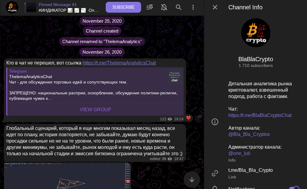 Деятельность в мессенджере автор развернул 25 ноября 2020 года. Во вступительной публикации эксперт сразу прикрепил ссылку на BlaBlaCryptoChat и микро форум по индикатору Thelema Analytics. Под начальными постами комментарии закрыты, однако позже эксперт телеграм-канала Bla Bla Crypto проблему решил, предоставив всем подписчикам доступ к микро чату под публикациями.