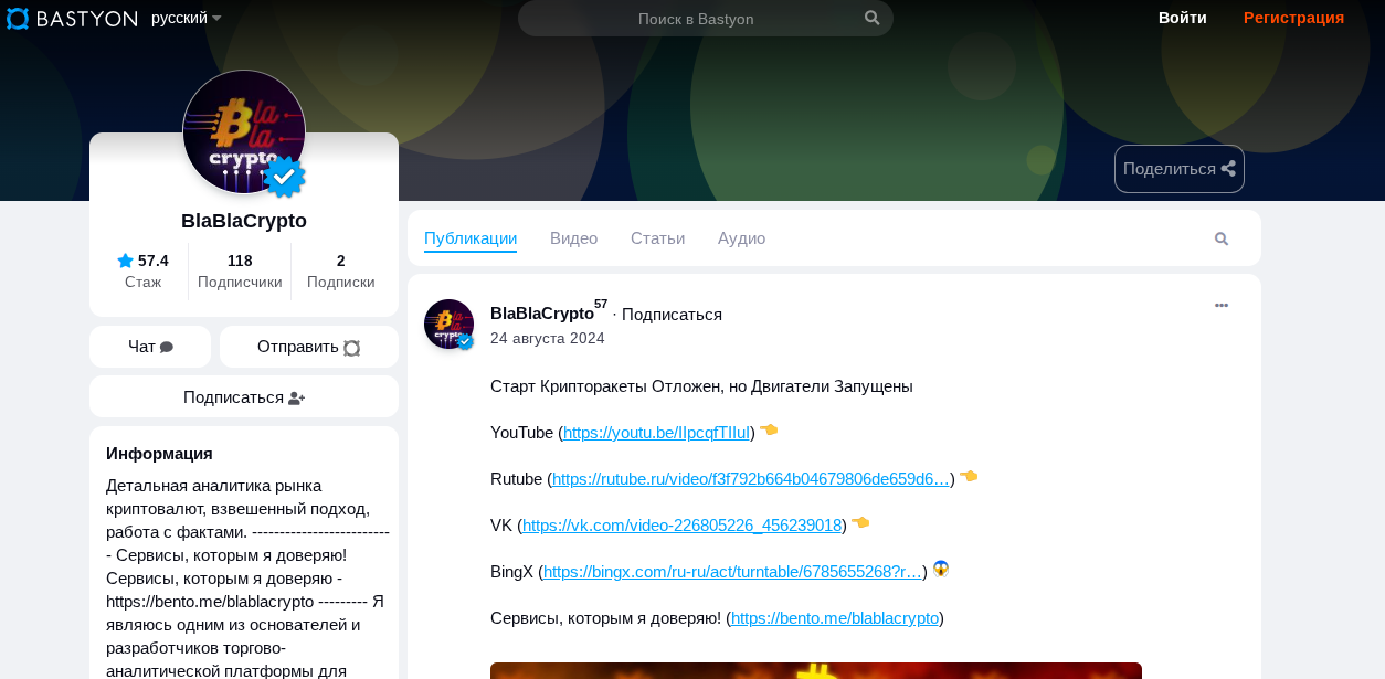 Рейтинг на Bastyon у эксперта 57.4, а это указывает на востребованность среди аудитории. Отдельный сайт проект BlablaCrypto пока не имеет.