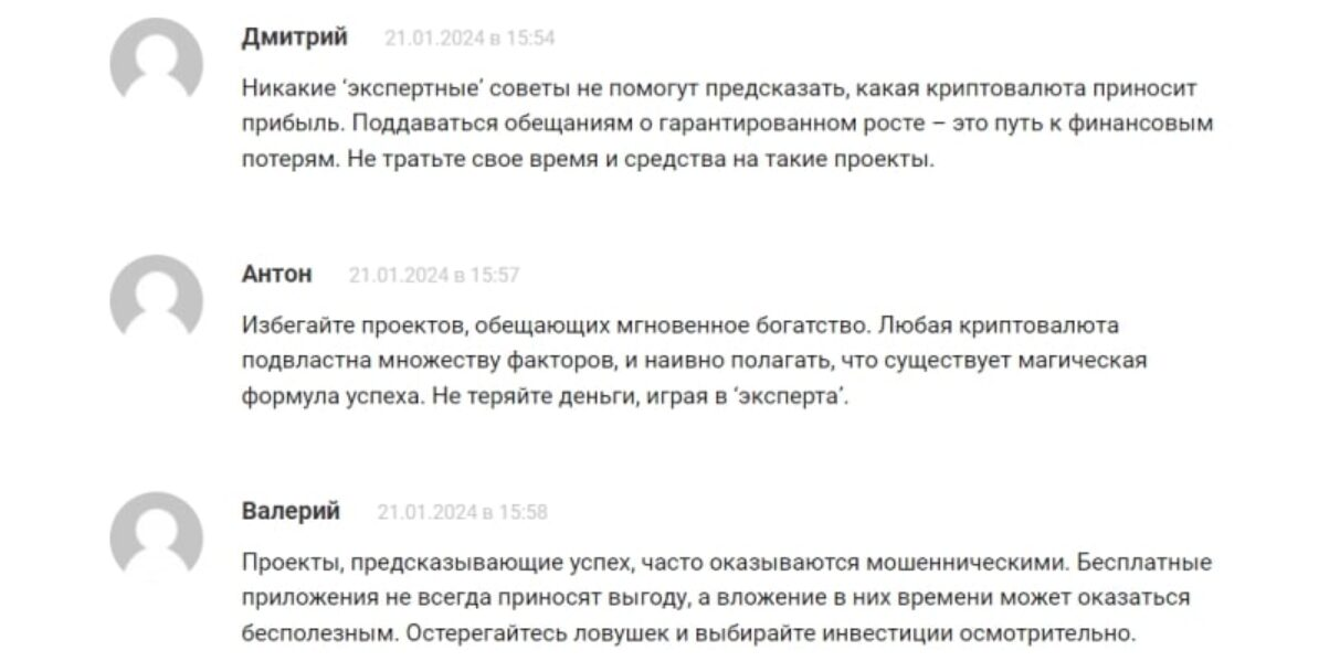 В сети мы долго искали фидбеки и все таки их нашли. Пользователи в отрицательных отзывах пишет о невозможности по сигналам автора предугадать движение криптовалюты.