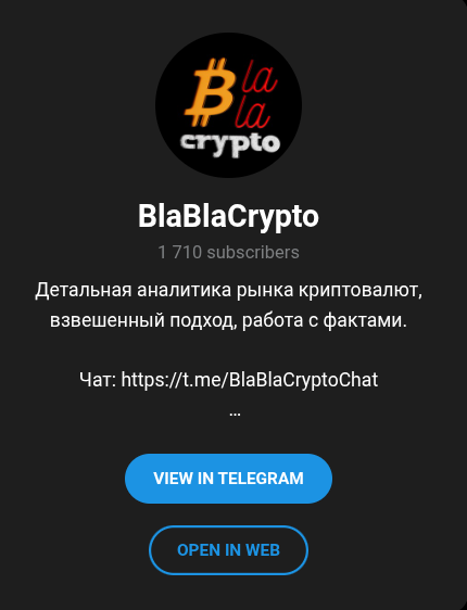 Описание сообщества создатель сообщества BlablaCrypto использует, чтобы привлечь внимание. Эксперт утверждает, что в паблике подписчики получают только детальную аналитику. Помимо этого, владелец телеграм-канала обещает взвешенный подход и работу с фактами.