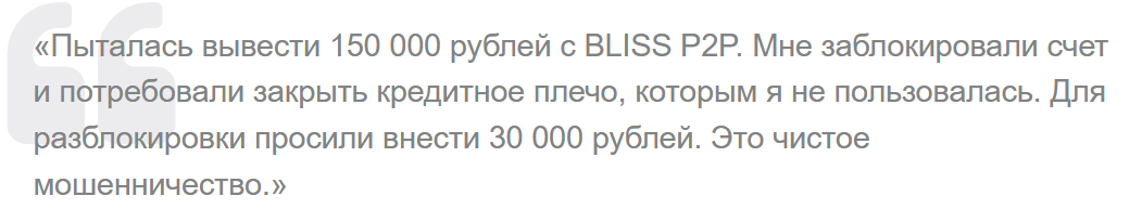 Стоит отметить, что упоминаний в сети достаточно мало, но некоторые называют проект финансовой пирамидой, хотя и не жалуются на потерю средств. Такие пользователи в отзывах о Bliss P2P пишут, что даже если кто-то и получал выплаты, в ближайшее время это прекратится, то есть, репутация у площадки больше отрицательная.