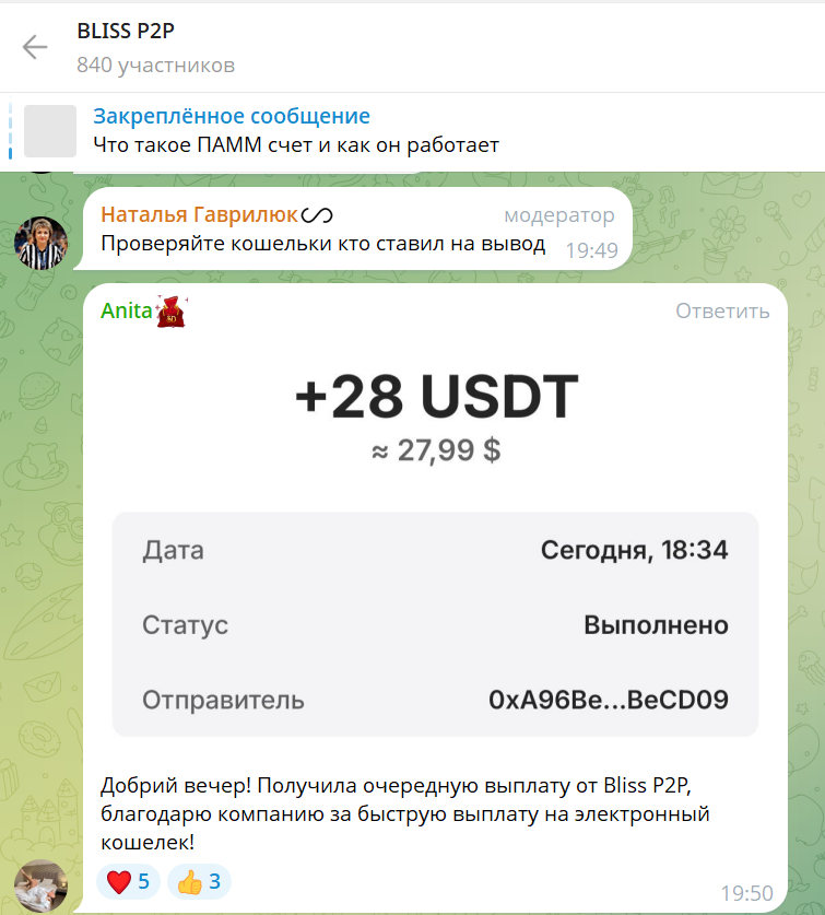 У проекта есть группа в Телеграмм, где 840 участников, причем во время проверки в ноябре 2025 года почти 200 из них были в сети. Пользователи общаются, а некоторые даже присылают скриншоты с выплатами, причем в качестве администраторов представлены Наталья Гаврилюк и Николай Васильчук, но кто это такие, неизвестно.