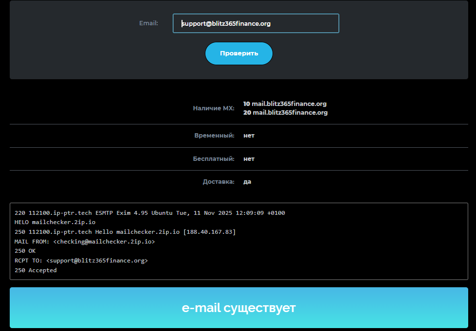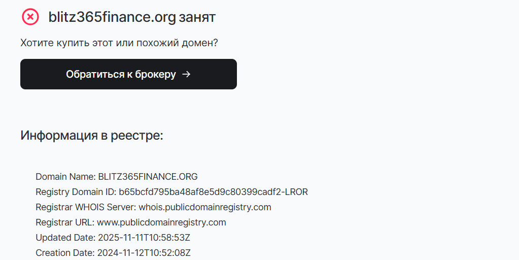 Blitz Finance позиционируется анонимными основателями как ведущая торговая платформа, которая позволяет инвесторам по всему миру использовать возможности фондового рынка. Обслуживание клиентов началось якобы в 2020 году, но в данных из реестра фигурирует только две даты – создание сайта 12.11.2024 и обновления за 11.11.2025.