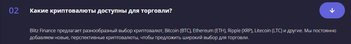 Никакой конкретики ни по одному из планов Blitz Finance не даёт – неизвестно кредитное плечо, спреды, комиссии системы и пр. На сайте уточняется только выбор криптовалют:
