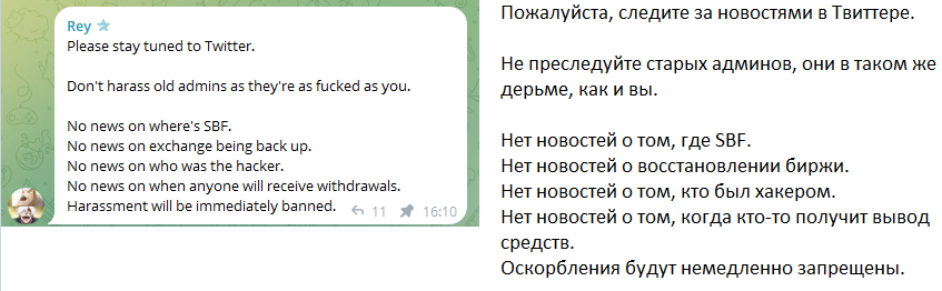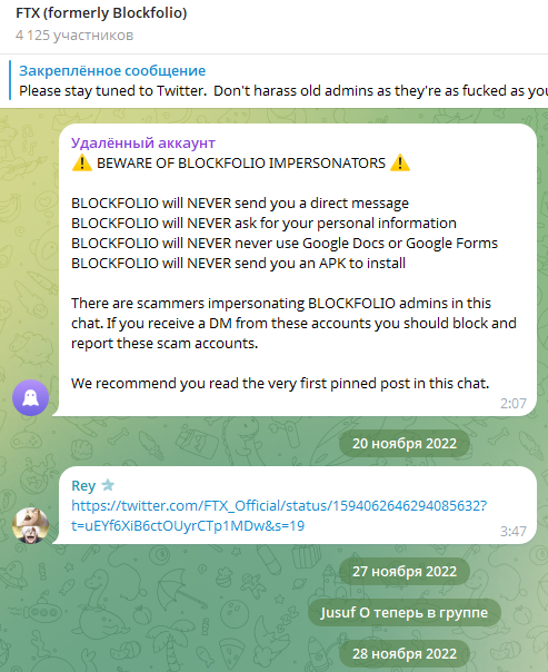 В ТГ сообществе Blockfolio было размещено объявление от руководства о том, что не нужно «преследовать старых админов» ввиду потери финансовых средств клиентами платформы.