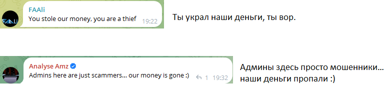 - в телеграм-сообществе опубликовано огромное количество негативных отзывов подписчиков о скам-системе;
