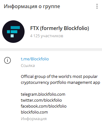 Организация в Телеграме представлена группой FTX formerly Blockfolio. На канал подписано 4 125 фолловеров.