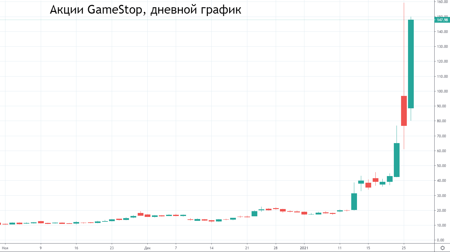 Gamestop (GME) — примечательный пример огромного гамма сдавливания. GME столкнулись с более высокой ценой акций в начале года (2021) в результате сдавливания. Многие финансовые аналитики пришли к выводу, что накачка стоимости акций GME в январе была основана на коротком сжатии. Некоторые институциональные инвесторы предсказывали, что цена акций Gamestop упадет, поскольку считали, что бизнес-модель устарела, а затем пошли на короткую продажу акций, желая получить прибыль. В тот момент, когда розничные инвесторы скупали акции в больших объемах, короткие продавцы были вынуждены оставить свои позиции и так же купить акции, что вызвало бычий рост цен. Хедж-фонды, которые играли против GME, были вынуждены закрыть свои позиции на продажу, поскольку акции Gamestop продолжали расти в цене. Как итог, GME выросла более чем на 4800% за год.
