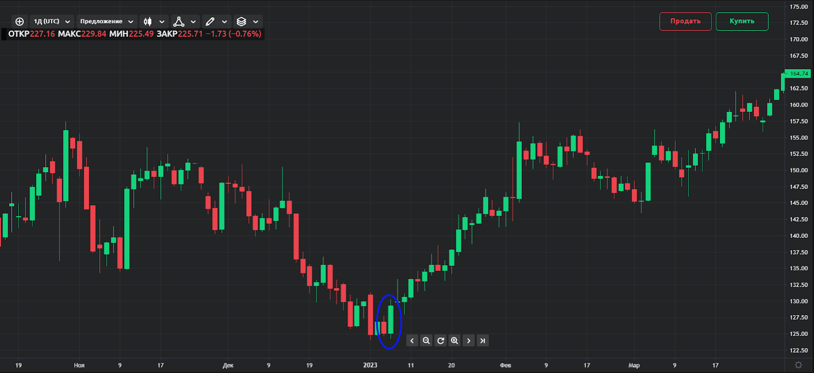 На графике отмечен сформировавшийся паттерн бычье поглощение, предшествовавший смене тренда на восходящий.