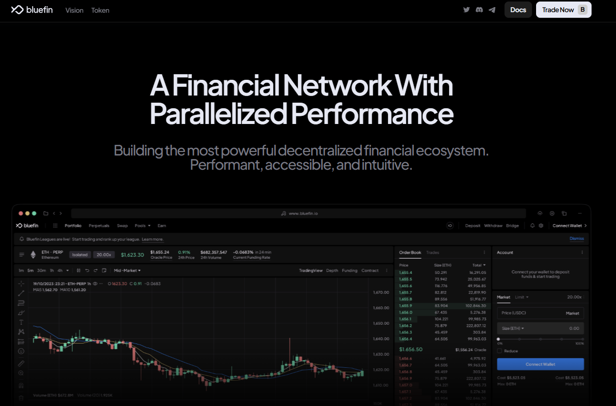 На бирже используется блокчейн Sui, когда большинство конкурентов работают на Ethereum, что предлагает некоторые преимущества – например, обработка транзакций происходит быстрее 1 секунды, а комиссия за это минимальная. Также для торговли в крипто BlueFin оставил «книги ордеров», которые были упразднены большинством криптовалютных площадок, но такой формат привычнее для трейдеров и позволяет выставлять лимитные заявки.