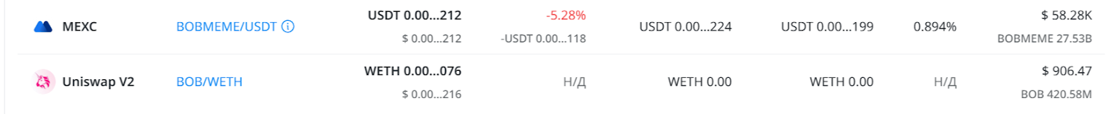 Также на тематических площадках можно узнать стоимость актива на текущую дату. В декабре 2025 года курс крипты Bob составляет $0.000212, однако подтвердить эти данные невозможно, так как создатели токена отмалчиваются.
